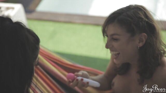 - Description: After watching Rey's home made sex video, Carrie follows the video's final message and meets her by the pool. Tingling with excitement, Carrie leans in to kiss Rey, who points out several overlooking glass buildings. Thrilled at the idea of being watched, Carrie strips naked and explores Rey's body, playing her part in her very own sex show. We love the use of the swinging hammock in this scene, as Carrie lies back into the seat and comes hard fromslow, sensual oral sex along with a powerful vibrating toy. Ready for her turn, Rey bends over and uses the hammock to support her hips, pushing herself against Carrie. Panting and giggling, they smile and wave at the glass windows of the overlooking buildings, thanking their unknown audience for watching their best show yet.