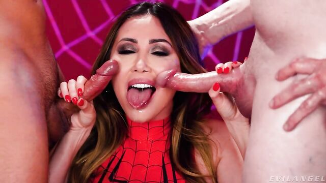 - Description: Statuesque, stacked stunner Kianna Dior portrays The Amazing SpiderGirl in a special parody scene for Halloween! The long-haired MILF beauty's skin-tight, red-and-black disguise shows off her big boobs. She takes off her mask, drawing two hard-ons (and the audience) into her web! Hungering to give blowjobs, Kianna kneels between two naked, ready erections. When she's not wetly sucking Jonni Darkko and Jay Smooth's hard boners, she's talking dirty! Kianna swirls her tongue on the tools and strokes the shafts with manicured fingers. Drool runs down her chin. She groans, gurgles and gasps as Jonni's big cock fucks her throat. This BJ superhero deepthroats both dicks, sucks balls and plays with the slobber strands connecting the pricks to her face. Wanting her semen fix, Kianna says, 'Blow your web on my face.' A thick, sloppy double cum facial coats her forehead and fills her eye sockets, dripping onto her tongue and tits. The guys' rods smear jism into her skin and mouth. She swallows sperm, saying her super powers are increasing! A graphic instant replay shows the facial slathering again, close up and in slow-motion!
