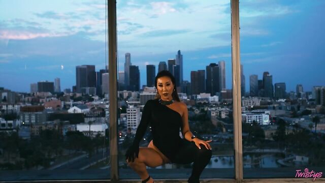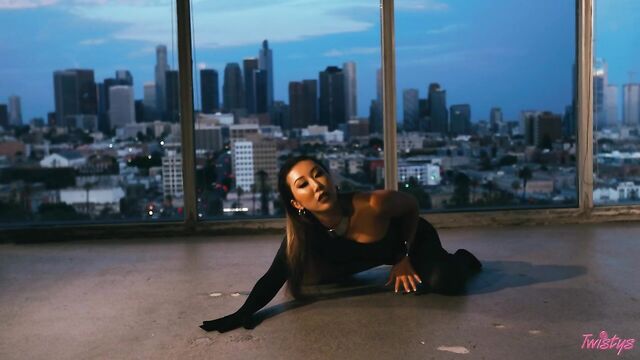 - Description: High up in the studio surrounded by the stunning city skyline of downtown LA, October Treat of the Month Nicole Doshi looks glam and fabulous in a short skirt and knee-high boots as she seductively dances and twerks her firm ass. The kinky brunette teases the camera with her gorgeous body, before sliding down her black thong and putting the lingerie into her mouth. Next, with her long hair slicked back, Nicole dazzles in a sexy one-piece which shows off her mouthwatering curves and slender legs. By the time it is dark outside, the feisty babe has stripped completely naked so that we have a full, unhindered view of her pussy and beautiful round tits. Feeling horny, Nicole sits astride a chair and starts playing with herself until she orgasms, then she finishes by tasting her sweet pussy juices!