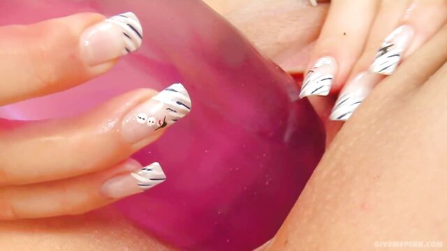 - Description: Bridget is a blonde with a super sexy body. She teases us by riding up and down a big dildo. We get some great close ups of her wide open pussy.