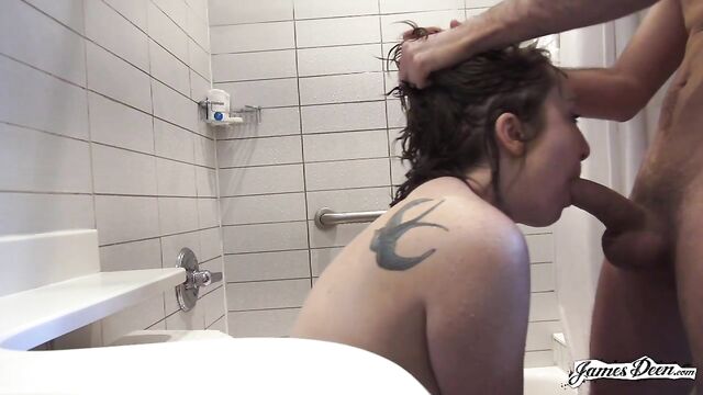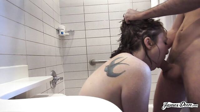 - Description: Amy Riskowitz hides half of her bare-naked body behind the white, almost see-through shower curtain. She slowly slides the curtain to the side exposing her bodacious curves as she strides under the shower head drizzling with warm water. She pumps some body wash from the bottle, mixes it with some water and directly applies it to her big tits and freshly-shaved pussy. She continues on with her shower routine as she washes her hair with shampoo. She comfortably talks to someone behind the camera as washes everything off from her body revealing all of her tattoos. She squeezes excess water from her hair and pats herself dry using hotel tissues. James Deen shows up in front of the camera, already naked. With both of them nude and exposed, anyone would expect them to jump into each other and start fucking. But that did not happen at all. They just stood inside the bathroom, talking to each other. It looks like they were getting to know each other. Realizing that the bathroom napkin couldn’t completely dry her off, she takes a towel from the counter, dries herself off then covers her body with it. Her body being covered did not last long. The next thing she knew, she was once again fully naked, on her knees, on the bathroom floor deep throating a big dick. She almost choked every time he thrusts inside her mouth but she finds the sexual act pleasurable anyway. Knowing that Amy loves anal sex way too much, James turns her around with her head almost on the toilet. It’s a relief to see that the toilet seat is covered. He rammed into her fuck hole making her scream at the sudden action. The current position wasn’t giving him enough pleasure so he decides to push her upper body even lower to the ground that she is almost seeing the gray tiles of the bathroom floor. Feeling her about to reach climax, he pulls his dick out of her fuck hole, shoves it inside her mouth, pulls it out again and slammed it into her pussy making her release her warm cum into his big dick without any warning. Anal sex was too rough that Amy ended up on the bathroom floor.
