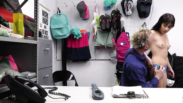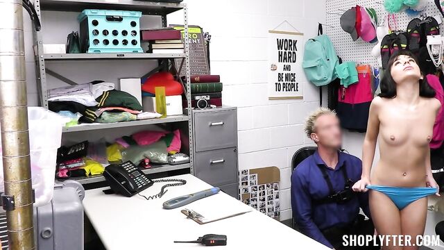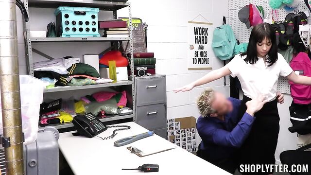 - Description: Aria is taken for interrogation under shoplifting suspicions. Officer Clarke performs a thorough process to find out who she is and what she has taken. After stripping Aria and doing a full cavity search, she seems clear, but Clarke detects her hiding a perfume bottle in a drawer when he leaves the room for a couple of minutes. Aria quickly breaks down and tells Clarke that she comes from a very conservative family, and her father doesn't allow her to wear a lot of makeup. She confesses trying to steal a perfume bottle from the mall to at least feel like other girls her age. Luckily, Clarke is understanding of her situation, offering her a mutually beneficial agreement. Aria takes her way out by giving the officer a nice blowjob and riding his cock.