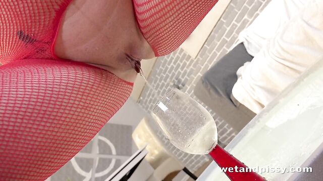 - Description: Gorgeous brunette Victoria Daniels returns to Wet and Pissy for another amazing wet porn scene with us and as she teases in a red crotchless bodystocking and a cropped top. She sits down on the couch and pulls at her XXL pussy lips before aiming a stream of her golden piss onto the coffee table! This naughty minx heads over to the table and rubs her big tits in her juices, sucking them up off her fingers then takes off her top to mop up her pee puddle. Victoria sucks more of her piss from her top then heads over to the dining table and gets hold of a wine glass. Sitting down on the coffee table, she fucks her wet pussy with the stem of the wine glass then squats above it before filling it with more of her warm piss! She pours it into her mouth and spits it down onto her outfit then uses a pump on her pussy, pausing to pee right into it a few times! Victoria then moves over to a jelly dildo which she uses to toy her pussy as she bends over the coffee table, then positions herself so she can ride it as it sticks to the table top. As this horny brunette pulls herself off the shaft, she masturbates and pisses all over the floor to finish her latest pissing porn scene with us!