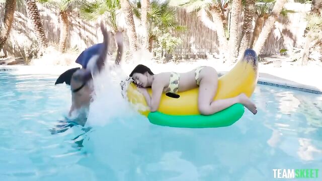 - Description: Remember Jaws? With that vicious great white shark swimming around, things get pretty tense. So when Natalie Brooks gets stalked by a -thirsty shark in the deep end of the pool, she nearly jumps out of her bikini! Luckily, it's just her neighbor dressed up in a shark costume, and Natalie couldn't be more relieved. But now that she's all excited, she needs to get her energy out somehow. She takes the prankster inside and lets him take a dip in her deep end. She plays with his thick pool noodle, licking the tip of his cock and letting him dive into her wet pussy. Then, she takes a tidal wave of cum on her face! Natalie's going to need a bigger boat...