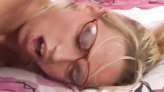 - Description: Sexy blonde slut Nicki Hunter is dressed in her school uniform and sexy glasses. She is lying in beds reading, she slowly starts to caress her firm breasts until he interrupts her. She can't help but rub his strong chest and strip him of his shirt soon she is stripped of her blouse, revealing her beautiful breasts. She slowly starts to suck his big hard prick, she lifts her skirt to reveal pretty white panties which she soon takes off to show him her shaved snatch. Nicki climbs on top of his hard rod and allows him to enter her tight pussy, then she gets on all fours and he pounds her doggystyle. He finishes up by glazing her pretty face with his hot cum.