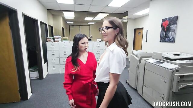 - Description: For her big college assignment, Lulu needs to observe her stepdad, Allen, while he works. She wants to get into the mind of an executive, but his pesky intern, Violet, keeps getting in the way. Later in the breakroom, Violet shows Lulu that they can have a little fun, too, and licks cookie crumbs off her lips. Allen sees this, so Violet exits the room, and Lulu uses this opportunity to suck her stepdad’s cock. The next day, Violet is up to her usual antics, trying to get Allen’s attention, although she wants Lulu to join in this time. They share an intense threesome right there in the office. Allen fucks Lulu until he busts a load inside of her.