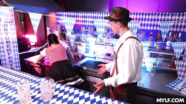 - Description: Nick is turning 21 at midnight, so he’s trying to sneak into the Oktoberfest-themed bar around the corner to celebrate. The naive boy tries to blend in and flirts with the hot bartender, Payton, a busty milf who thinks he is cute but definitely not age-appropriate, so she throws him out of the bar. Determined to get in, Nick comes up with a plan: he puts on an outfit and pretends to be another guy. Payton easily sees through Nick’s ridiculous disguise, but the gal is horny and the boy is about to celebrate his 21st birthday, so she might give him a birthday present as well!