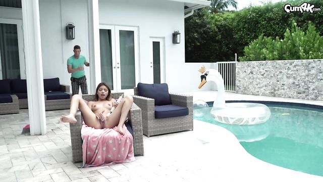 - Description: Stepbro creeps on his stepsis as she masturbates in the backyard and can’t believe how wet her pussy is.