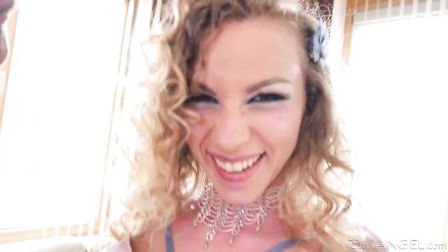 - Description: Dressed in lacy lingerie, bubbly French babe Angel Emily flaunts her fit body. The spunky blonde stretches her holes and fingers her pink twat, soon welcoming Charlie Dean and Mike Angelo. Angel gives their humongous cocks blowjobs. Charlie and Mike manhandle Emily, one fucking her asshole while the other fucks her face. Angel's orgasmic devil's threesome includes harsh double-vaginal penetration, anal reaming, ass-to-mouth cocksucking and lewd rim jobs. For the climax, Mike slathers Angel in a cum facial and Charlie fires a hot load over her backside.