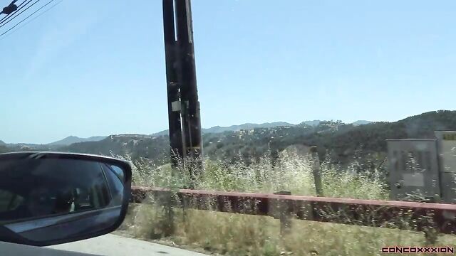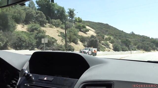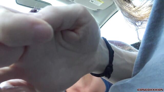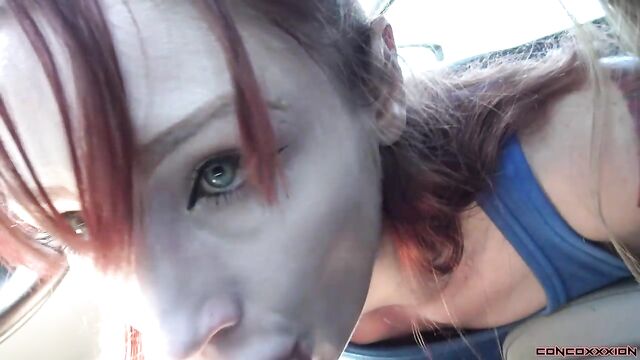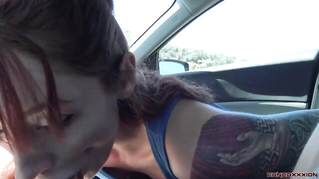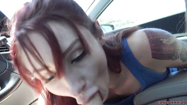 - Description: Gorgeous red head, Violet Monroe, is riding in the car while Conor is driving. Violet tells of a story of when she gave Conor head in an Uber, once. She may have been a little hung over, and blew him for several minutes in this Uber. Violet says that she didn't finish off Conor, though...and she has never given a public blowjob all the way to a finish. Conor begins to play with Violet's boobs as she is talking. She pulls her boobs out of her tank top, 'It's a great day to have your boobs out!' Violet lifts her skirt, and pulls her panties to the side..and starts to play with her pussy. Conor also starts to play with her, as they are stopped at a red light. Violet points out to Conor that the man beside them is looking at them from his truck. She tells Conor to take them to a more scenic spot, away from all the traffic. Violet plays with her pussy as they are driving down the road. She strips off her bra, and pulls out her boobs again... flashing several cars. They pull over on the side of the road, and Violet starts to give Conor head as they are pulled over. Conor drives off as Violet gives him head. Violet deep throats his cock as he drives down the road. They stop again on the side of the road, and Violet sits up. They drive off again, and Violet strokes his cock as they drive. They find a spot to pull over, again, and Violet gets down and sucks his cock. She strokes and sucks his hard cock as they are pulled over and cars are passing by. Violet sucks and deep throats Conor's cock until he cums all inside of her mouth. Violet spits in the cum in her hand, and sucks it all back up.