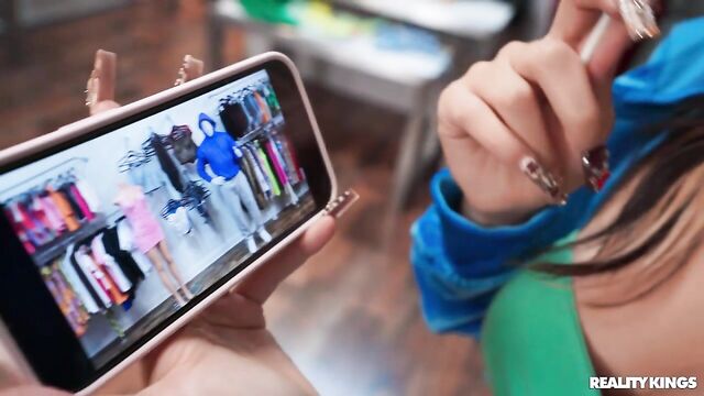 - Description: Violet Gems and James Angel have planned a peak prank, as long as they can distract boutique owner Lilly Hall. Violet sends Lilly to search for a size in the back room and James hurriedly puts on a mannequin disguise to scare some shoppers. Their video goes so well, Violet decides to have some more fun sucking her BF's cock, but when Lilly catches her she chases James out and drags Violet into the changing room to spank her! She licks the prankster's pussy and tells Violet to get on her knees and work to make up for what she did. It's no prank as the babes 69 and scissor in the fitting room.