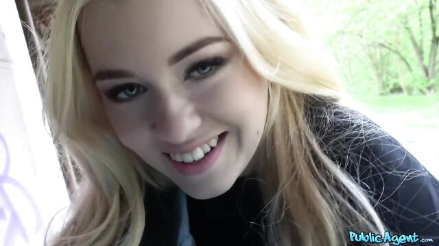 - Description: Misha is a beautiful student studying at university, but her parents are rich and send her lots of money, so she was a hard sell. A gorgeous young blonde in a schoolgirl skirt, but man, could she negotiate! She showed me her puffy boobs and tight student pussy for some fast cash, and she seemed to really enjoy it. I told her she made my dick hard, and she asked to see, so I whipped him out for her right on the side of the road. She told me she liked my big dick, so I asked if she would suck him for me. The naughty stranger almost fit it all in her mouth! Oh, I loved it! We were both so turned on, we fucked by the river with Misha riding me, her panties pulled to the side. What a lovely girl! And how lovely she looked with my cum all over her face!