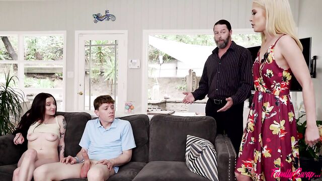 - Description: What would happen if four families each contributed one member to create a new family? In this episode of Family Swap, swap siblings Rion King and Leia Rae are feeling some sexual tension as they enjoy some family time by playing a board game. Their swap mom, Tiffany Fox, warns the kids that they're going to act like a real family, but as soon as she leaves to take a shower the kids' swap dad, Jack Vegas, lets them know he's cool with their flirtation since he's hoping to get with his swap wife in a biblical way over the weekend. He just wants them to understand that they need to keep it hidden from Tiffany since she takes the swap seriously. With dad's blessing, Rion and Leia get busy with each other. When Rion pops Leia's big tits out of her top, Jack claims that he's uncomfortable and pretends to leave when in reality he just gets out of sight so he can watch.Soon enough, Rion has his hands down Leia's panties so he can diddle her clit. She pops Rion's cock out so she can get on her knees and start sucking. Rion waits until he can't take it any longer and shoves Leia onto the couch so he can eat her out until she's nice and wet and ready to slide down on his hardon. Slipping his hands beneath Leia's ass, Rion helps hold her in place as she rides his fuck stick. The kids barely even notice as Jack returns and asks them to cut it out for a bit since he's just been kicked out of the bedroom since Tiffany doesn't want her seeing him naked. Before Jack can try again, Tiffany walks out and catches them in the act. She freaks out, but Jack calms her down by kissing her on the neck and giving her the affection she's craving. When Tiffany capitulates, Jack tells the kids to come over so all three of them can give their swap mommy the attention she's been missing.With her whole swap family coming together to make sure she's feeling loved, Tiffany begins to unwind and open herself up to the family orgy that's building. Leia gets to enjoy dad dick in her mouth while Rion eats Tiffany out. Then Tiffany gets to have Rion pounding her pussy while Leia rides Jack's hardon. Climbing onto her knees, Tiffany gets double stuffed as she sucks Rion off and has Jack pounding her from behind. Leia can't help but masturbate at the hot sight. Until she gets to lay down and let daddy take care of her while Tiffany rides Rion. Jack pulls out to cover his swap daughter in jizz as Rion creampies his swap mommy. The swap siblings may have started out only into each other, but it turns out that playing with the whole family is lots of fun.