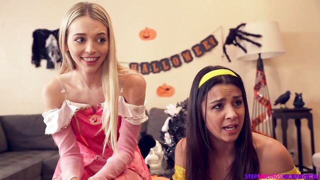 - Description: Kylie Rocket and her friend Lily Larimar have dressed up in skanky Halloween outfits that show off all their best assets. Kylie's mom wants the girls to put a scarecrow out for trick or treaters, but before they do it Kyle decides they should have a little bit of fun. She leaves for a minute and comes back with a big dildo to put on the scarecrow. The girls take turns sucking it, then zip it into the scarecrow's jeans and proclaim it a sex toy. After Lily sucks the dildo a bit more, Kylie gets to her feet, lifts her miniskirt, and starts riding. She talks Lily into taking a turn by saying how good it feels!Saying that maybe they went a little too far with it, Kylie gets Lily to come out of the room. What they don't know is that while they were checking the candy Kylie's stepbrother, Nathan Bronson, put himself in the scarecrow outfit with his cock sticking out. Lily wants to play with their toy one last time, but when she finds a real dick she keeps it to herself. She starts sucking in a wet and wild blowjob, then lifts her skirt and starts riding scarecrow Nathan in reverse doggy. Kylie notices that Lily seems to be having a really good time. She comes over to watch and slips her hand beneath her skirt to masturbate. When Kylie insists on having a turn, though, Lily claims that's not such a good idea.Pulling her BFF aside, Kylie briefly strokes what she thinks is the dildo and then hops onto it. That's when she realizes she's riding her stepbrother's dick. While Kylie is freaking out about it, Lily decides to ride again. She eventually talks Kylie into rubbing her tits, which opens the door to a full on threesome. Kylie lets herself be talked into letting Nathan do her in doggy while she eats Lily out. Lily gets a turn in the middle as she lays on her back with Nathan's hardon between her thighs and Kylie riding her mouth. The girls swap spots so that Lily can make intimate eye contact with Nathan as he brings Kylie off and then reaches his own finish line. Pulling out, Nathan cums all over Kylie's stomach as the girls enjoy a satisfied kiss.