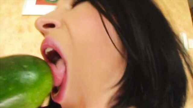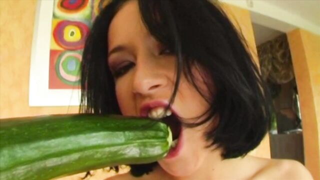 - Description: A stunning babe with a perfect set of tits and a tight pussy puts a bunch of strawberries and a large zucchini deep inside her wet hole.
