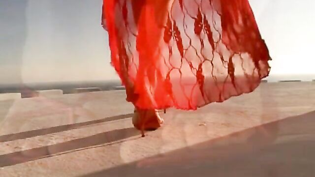 - Description: I hope you like calendar-style glamour pictures, because in this scene we emphasized the soft side of nudity. With a sizzling red dress and on a charming tropical location, you can now take a look at me, enjoying the last rays of the sunset.