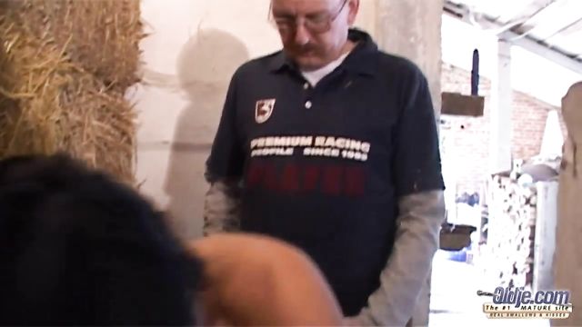 - Description: An old farmer is working in his shed. Untill she jumps on him from behind and takes him. And he is a very willing victim!