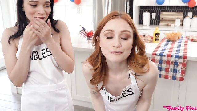 - Description: Scarlet Skies and her stepbrother Nick Strokes can't agree about who is going to do the cooking for their fourth of July party. Scarlet's BFF Selina Imai suggests they have a cookoff. When Nick agrees, the girls go to change while Nick goes straight to the barbeque outside.The girls show up wearing thongs and matching Nubiles aprons. They claim Nick can't cook with a hard dick, and he goes on to burn the food. Scarlet offers a rematch, but first the girls know they need to get poor Nick off. They get on their knees in front of him to deliver a BJ together, then get to their feet to kickstart their cookout threesome.The girls get to their feet and lean over the counter to present Nick with a pussy buffet. Getting on the counter, Selina spreads her thighs for Nick to plunge deep. Scarlet puts Nick on his back on the floor so she can ride him in reverse cowgirl. She thrusts her hips and bounces away until he blows his load. With Nick's cum dripping out of her, Scarlet dredges her fingers through the treat and brings it to her lips so she can share their cream pie dessert.