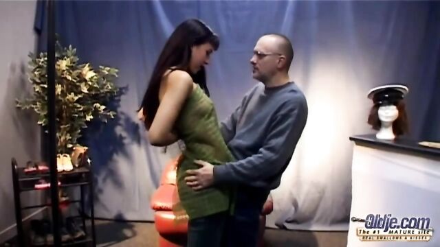 - Description: She wants to see the new collection. Once in the shop, she starts with a striptease and asks him to help her! Following she seduces him and fucks him.
