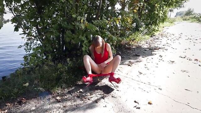- Description: Natalie Russ is red hot in scarlet‚ in her dress, fishnet pantyhose and jeweled-velvet spike heels are all the same sizzling shade. The petite blonde is outdoors by a large river on a sunny day, playing with a black-and-red flogger. Her hands caress her large breasts, slipping inside of the top of her dress, before she hikes it up around her waist. Next, she rubs her crotch and teases her shaved pussy with the handle of the flogger, then peels her mesh pantyhose down to her knees. She squats and pees, fingering her clit as the crystal-clear stream splashes on the ground, then she spit-wets her slit, lubing it ready for her whip once more. After grinding and circling the butt-end against her clit, she uses her fingers again, slipping them inside. Sitting down with her hose around her ankles stretched tight between them as she splays her legs wide Natalie continues to masturbate. She pumps her snatch with her fingers and works the whip against her clit, with her dress bunched right up to expose her big, gorgeous tits. So caught up in pleasure she's oblivious to boats sailing by, she strums her slit with her fingers, her breath coming in deep gasps as she nears her climax. Then it hits, so intensely she pees again, squirting on the ground. As the camera captures the extent of her streams, she stands and adjusts her pantyhose and dress, covering up once again. Finally, she struts away on her high heels as the picture fades.