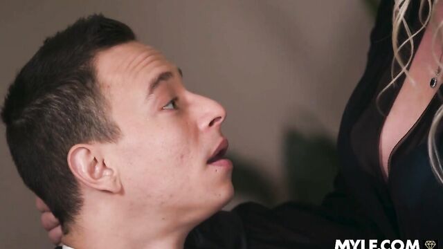 - Description: Nikki’s boss is the hottest MILF ever, so he finds it really hard to concentrate on what she’s saying. All he can think of is diving forward and sucking on her tits for hours while she talks and talks about markets, shares, and whatever else she’s saying. Luckily for him, Brittany is as hot as she is a slut, so as soon as she picks up on the fact that this young man is staring at her tits, she presses herself against him and invites him to do whatever the fuck he wants with her tits. After he’s had some fun playing with them, she lays him on the table and sucks his cock like the pro she is, he can barely stop himself from cumming right then and there! After that he sits on a big chair and she climbs on top of it so he can eat her pussy and get her nice and wet to pound the ever-living shit out of the hot MILF until he explodes all over her!