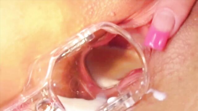 - Description: Take a look deep inside this brunette's pink pussy. Watch this babe satisfy herself with a big dildo which she puts insider her tight juicy pussy.