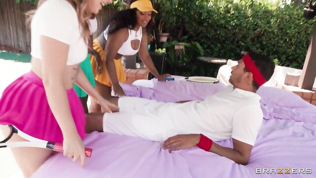 - Description: A trio of sexy ladies (Anna Claire Clouds, Baby Gemini and Jayla Page) are practicing their tennis moves with coach Alex Jones. All is going great... until they get their bill and decide they don't want to pay the sky high price. The ladies instead decide to give the coach a steamy four-way fucking to cover their lesson. A trade Alex can't resist!