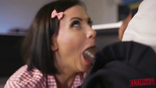 - Description: Sexy brunette Alysa Gap knelt before Yves Morgan, unzipping his suit pants eagerly! Out sprang a massive ebony cock making her gasp???? She looked so ready to worship that beautiful black meat. She wrapped her lips around shaft. Sucking sloppily, she gagged herself balls-deep until he grunted ready! Yves bent the petite blonde over kitchen island spreading cheeks wide???? He buried his face between asscheeks eating out tight hole enthusiastically! Tongue probing deep into puckered starfish while Alysa squealed in delight. Then, his thick pole speared into wet cunt pounding away wildly???? Her huge tits bounced as Yves railed doggy style hammering pussy into submission! Suddenly he pulled out ramming balls-deep up that tiny asshole instead! Stretching it obscenely open with girthy cock????He was set on wrecking her shitter! Alysa moaned getting anal destroyed on countertop. The stud pounded relentlessly until she couldn't take it any longer. Then he made her kneel in front of him and glazed Alyssa's face white with giant load! What an intense interracial sodomy scene!!