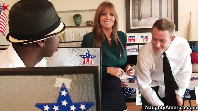 - Description: Darla Crane has set up a polling station at her house in hopes that people in the suburbs will be able to cast their vote there on Election Day, as opposed to having to drive to the city. Her son's friends Jon Jon and Bill helped her set up shop, but when she finds out they think voting is a waste of time, she's a tad concerned. But redheaded MILF with big tits knows her assets and how they can be used to sway the minds of the people...and her son's friends. Once she starts sucking both of their big dicks, the guys definitely decide to punch the hole.