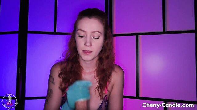 - Description: POV: redhead Cherry Candle’s big tits bounce in her tight top while she grips your throbbing big cock with slick blue gloves. Her long hair sways, tattoos flashing as she pumps you hard and steady, CFNM style. She smirks, dirty-talking how bad she wants your load. The fetish gloves slide faster, milking every vein till you explode. Thick ropes of cum splatter across her shiny blue gloves. Cherry grins, spreading the warm jizz between her fingers, letting it drip and ooze in gooey strings for the camera. She spreads the drops, eyes locked on you.