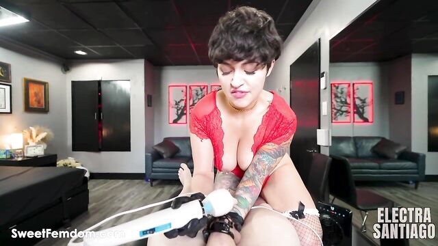 - Description: Miss Electra Santiago, with short hair and massive tits spilling out of red lingerie, towers over her locked-up bitch boy. Black gloves on, piercings flashing, she grinds her fat ass right on his desperate face while he’s crammed in that tiny cage. She laughs, calls him a pathetic worm, then grabs the Hitachi and presses it hard against his swollen caged cock. The vibe buzzes like crazy while her juicy pussy and asshole smother him till he can’t breathe. He squirms, begs, and finally explodes in his cage, cum leaking everywhere from nothing but her cruel ass and that toy. Pure femdom filth.