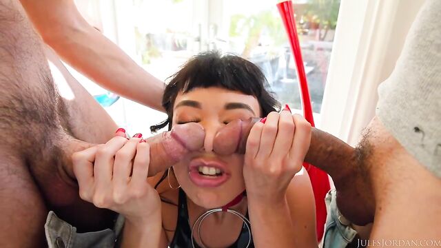 - Description: Little Puck’s wild double-penetration fantasy finally comes true in this intense threesome scene. It begins with her teasing in the living room, flaunting her sexy curves in a tight latex outfit, her big, huge tits nearly spilling out. She seductively shows off her body for the camera before two guys arrive, ready to fulfill her ultimate desire—getting two cocks in her pussy at the same time. Dropping to her knees, she eagerly sucks their cocks, switching back and forth with hunger and passion. Things heat up fast as they fuck her standing up in unique and acrobatic positions before moving to the couch for more hardcore action. Then comes the moment she’s been craving: both cocks stretch her pussy wide in a thrilling double-bag session that leaves her breathless. The intensity continues with rim jobs for both guys, followed by a rare and kinky twist—each guy fucks her armpit simultaneously. The scene climaxes with a messy double facial, both men cumming all over her big tits.