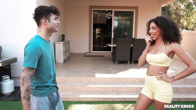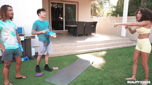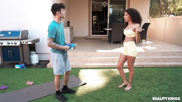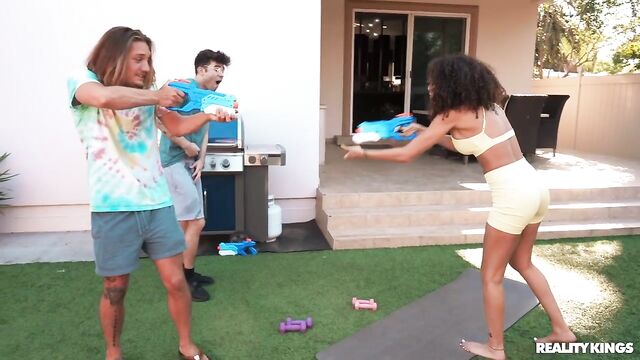 - Description: Frecklemonade is just trying to do some yoga outside when she gets caught in the middle of her cousin's water fight with his buddy, Enzo East. The hot yoga babe tells the guys off, but when Axel leaves to take a call, Enzo decides to shoot his shot, and Frecklemonade is DTF! She sucks him and rides him outside, then they fuck hard in the bedroom and he sprays her face with cum.