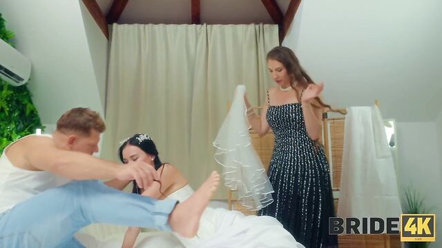 - Description: It’s the morning of the wedding, and everything is… almost under control. Between curling irons, creased linens, and a whirlwind of last-minute problems, a focused bride gets ready for the ceremony — accompanied by an endless stream of chatter from her well-meaning organizer. Meanwhile, in the same room, an unexpected visitor takes his place with bold familiarity. As the groom shuttles in and out with updates on roses, seating, and missing musicians, no one seems to acknowledge the obvious. Bold, strange, and darkly funny, this BRIDE4K.COM story captures the tension between ceremony and chaos — and the quiet decisions we make about what’s important.
