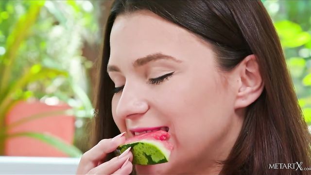 - Description: Gorgeous brunette Hayli Sanders is cutting up watermelon in the kitchen. As she takes a bite of the succulent fruit, juice trickles down her wrist and she licks it up. With a naughty sparkle in her eyes, she takes off her top to bare her beautiful breasts, then lets her shorts drop to the floor to reveal her sexy shaved pussy. Sitting up on the kitchen counter, she spreads her long legs and starts to stroke her hot slit, rubbing her clit, letting watermelon juice trickle down her slender body. She smears it over her skin as she masturbates with both hands, thrusting her fingers deep as she frigs herself to a sweet, sticky orgasm.