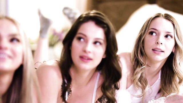 - Description: Three teens (Lily Larimar, Athena Faris, and Maddy May) are taking a fun personality quiz while having a slumber party. Athena and Maddy are a bit mischievous and flirty as they take the quiz, which makes Lily roll her eyes since her horny friends are soooo predictable.They are soon interrupted when Lily's stepmother, Sarah Vandella, checks in on them to offer snacks. The girls aren't hungry but Sarah is curious about the quiz and longingly lingers. The friends notice Sarah's longing expression and invite Sarah to join them. Sarah is a bit embarrassed but pleased as she joins them, though Lily is a bit annoyed.Sarah seems over the moon as she does typical slumber party things with the teens. They take quizzes, share stories, gossip... The whole time, the friends are enamored by Sarah, obviously drawn to her. However, Lily gradually becomes more embarrassed and sulky, clearly not enjoying having her stepmom hanging around THIS long.Finally, Lily pipes up, telling Sarah that this is supposed to be THEIR slumber party. Sarah is immediately apologetic, realizing she's overstayed her welcome, and the friends are annoyed at Lily for killing the mood. But Sarah takes ownership as she reveals that she's never had slumber parties of her own as a teen because she's a lesbian and other girls didn't want to be around her. The friends are supportive and Lily feels guilty.Sarah is about to leave but the friends invite her to stay. However, the friends admit their ulterior motives of wanting Sarah to stay around because they're attracted to her. Lily is exasperated, but unsurprised, by their horniness. Meanwhile, Sarah IS surprised to be hit on by the friends.The friends start coming onto Sarah while Lily watches on in shock and embarrassment... But with a little encouragement from her friends, maybe Lily can be convinced to join in on the fun, too!