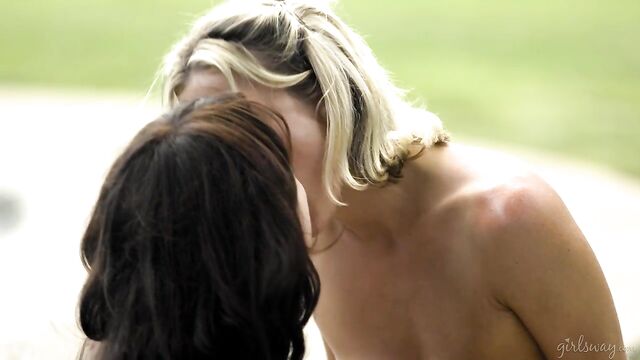 - Description: Aiden Ashley is a newly-out lesbian who is fresh from a recent divorce. She decides to shake things up a little by learning a new skill: swimming- but when she arrives at the swimming lesson location... she gets second thoughts. Just as she's about to make her way out, however, she is stopped by her new instructor, Whitney Wright, who asks her why she won't give the swimming class a chance. Aiden hesitates a moment and then reveals that she feels self-conscious about her body. Aiden looks at Whitney's bikini admiringly and says that if she wore something like that, she wouldn't look sexy in the least bit.Whitney can't help but disagree- she thinks that Aiden has an exquisite body, and would look sexy in ANYTHING that she wore. But Aiden isn't only self-conscious about her body, she's also worried that she'll look stupid in the ugly bathing suit she brought. Whitney agrees that the bathing suit leaves much to be desired, but she's determined to make Aiden feel like the goddess she truly is. She takes out a bikini and offers it to Aiden- it's never been tried on and she always keeps extras just in case her students forget theirs. Aiden agrees and leaves to go get changed. As Aiden slips in her new red bikini inside the house, she shoots peeks at Whitney as she rubs suntan lotion on her arms and thighs outside by the pool.When Aiden comes out of the house, Whitney is in awe of how sexy she looks in the bikini. Aiden seems happier, and more confident about her body. She thanks Whitney, and explains that it's been hard for her to feel beautiful these days- especially after her recent divorce. When Whitney shares that she's a lesbian as well, and offers to introduce Aiden to her friends and the rest of the community if she would like. Aiden is heartwarmed- she would love that, and that's actually one of the reasons she booked this swimming lesson: to get out of her comfort zone and meet new people. She's happy that she did- Whitney's taught her a whole lot already- she wonders what ELSE she can teach her. Whitney grins, mentioning that since she is SUPER early and the other swimmers won't be arriving for a while, she COULD lead Aiden in a little pre-swim warm-up. Aiden agrees, and they have playful sex on the poolside where Aiden will demonstrate just how deep she is willing to dive into her new sexuality.